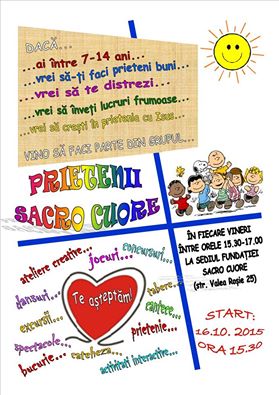 Fundaţia “Sacro Cuore” din Baia Mare deschide astăzi (9 octombrie) anul de voluntariat 2015-2016. Evenimentul are loc la sediul de pe str. Valea Roşie 25A, începînd cu ora 17. “Sacro Cuore” a fost înfiinţată în anul 2000, în Baia Mare, pentru a-i servi pe sărmani şi copii.