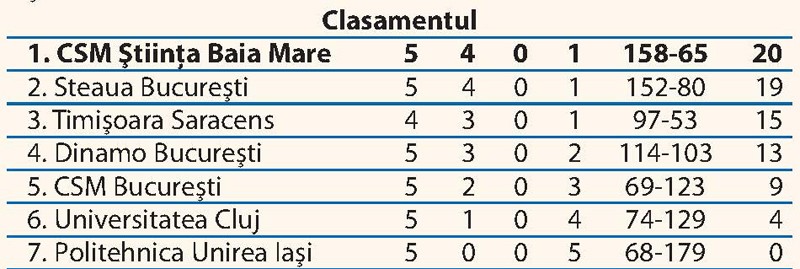 Rezultatele etapei 6: Timişoara Saracens – Dinamo Bucureşti 32-17; CSM Ştiinţa Baia Mare – Universitatea Cluj-Napoca 29-16; CSM Olimpia Bucureşti – Steaua Bucureşti 16-13. Politehnica Unirea Iaşi a stat.