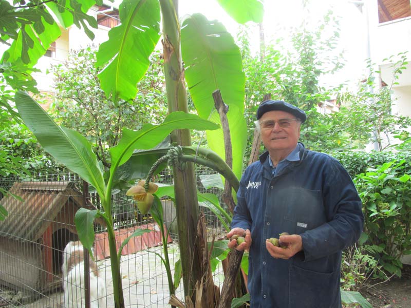 Pentru maturizarea fructelor, ar fi nevoie ca bananierul să fie ţinut într-o seră. Însă bananierul e cât casa şi ar avea nevoie de o seră foarte înaltă… În grădina băimăreanului se află de vreo zece ani şi un smochin – face fructe an de an, smochinele sunt dulci şi aromate, aşa că soţia lui Petru Bancoş (foto) face din ele gem – o delicatesă.