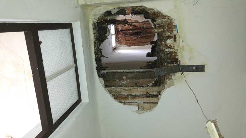 În orice moment poate să cadă pe noi tavanul şi atunci cine răspunde de treaba asta?! Primăria? Pot să moară aici oameni dacă ar cădea tavanul şi atunci cine răspunde de ei? Dar nu contează cred, că doar suntem foşti deţinuţi! Noi avem sediul aici cam din anul 2006. La început, când am venit, condiţiile erau mai bune pe vremea aceea, dar pe an ce a trecut s-au tot înrăutăţit, clădirea s-a tot degradat până ce într-o dimineaţă am venit la sediu şi am găsit tavanul căzut! Noi plătim o chirie lunară la primărie pentru acest spaţiu. Ce-i drept, suma e modică, vreo 30 de lei pe lună, dar condiţiile pentru ca un om să stea aici, şi un minut, nu sunt omeneşti. Am făcut solicitări la primărie, pentru a rezolva problema, sau a ne oferi un alt sediu, de cel puţin cinci ani. Când au început să repare sediul pictorilor de aici, de lângă noi, primarul ne-a promis atunci că ne mută în alt sediu şi aici ar fi urmat să preia asociaţia pictorilor. De atunci tot aşteptăm! Am făcut solicitări în scris, am avut „n” promisiuni.