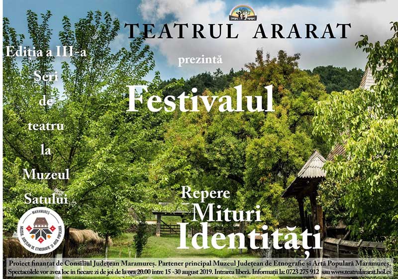 Joi, 15 august, începând cu ora 20, debutează a treia ediţie a Festivalului de teatru „Repere, Mituri, Identităţi”, susţinut de Teatrul Ararat în parteneriat cu Muzeul Judeţean de Etnografie şi Artă Populară Maramureş. Cu această ocazie, în fiecare zi de joi, pe parcursul lunii august, vor avea loc seri de teatru la Muzeul Satului din Baia Mare. Proiectul este finanţat de Consiliul Judeţean Maramureş. Intrarea este liberă.