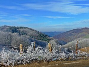 Continuăm drumul spre Suciu și Groșii Țibleșului, cu speranța măcar de a ieși din ceață. Dimpotrivă, până la un punct e și mai vârtoasă, doar că vedem haloul Soarelui, în ceață. Semn bun? În Suciu-centrul de comună, cotim dreapta spre cartierul țiganilor, apoi o luăm în sus spre așa-zisul Drum al Unirii, un județean ce iese în județul Bistrița-Năsăud spre Agrieș. Am ieșit din ceață și începem să vedem minunății. Dealuri înghețate, cu trovanți la vedere, la rândul lor înghețați.