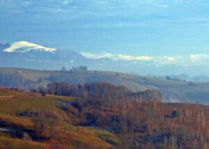 Nu înainte de a arunca o privire şi încolo… surpriză, ni se arată ochilor altă belvedere: așa cum vă așteptați, se vede de aici Șatra Pintii, dar în depărtare, abia schițată, se vede… Mogoșa! Coborâm, dăm iar de cețuri, iar zăpadă, gheață pe drum, dar a meritat. Ne salută de după arinii unui pârâu un superb cerb tânăr sulițar, cu două ciute. Nu reușim să le pozăm, nu se simt fotogenici, deși…meritau. O tânără familie în formare.