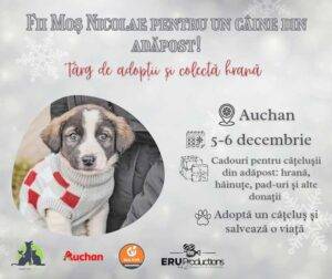 “Ediția aceasta este mai specială, deoarece dorim să răsfățăm toți cățelușii noștri din adăposturi cu cadouri frumoase, cu ocazia Sfântului Nicolae. După cum știți, în acea zi, copilașii primesc cadouri de la Moșul Nicolae. Ei bine, și cățelușii noștri au suflet de copilaș și dorim să le facem o surpriză frumoasă. Avem nevoie de hrană (umedă/uscată, junior/adult), hăinuțe de diferite mărimi pentru cățeluși, pad-uri, păturici și multe altele. Avem nevoie în special și de donații în bani, pentru a plăti facturile medicale și pentru a investi în proiectul “Casa Îngerașilor Răniți”, pe care dorim să o finalizăm cât de repede cu putință. Ar fi cel mai frumos cadou de sărbători pentru îngerașii noștri răniți. Vom avea, ca de obicei, și suflete pentru adopție responsabilă, dar nu uitați: un animăluț nu este un cadou de Crăciun! Este o responsabilitate pe viață, un membru al familiei!”, spun reprezentanții Asociației Fight for Animals. Târgul caritabil de adopții și colectă de hrană se desfășoară în perioada 5-6 decembrie, la Auchan Baia Mare.
