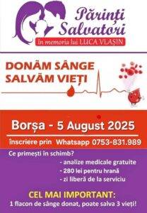 „A devenit deja o tradiție frumoasă ca să donăm sânge (și) la Spitalul de Recuperare din Borșa, marți, 5 august 2025, revenim la Borșa pentru că aici sunt mulți oameni minunați care doresc să doneze sânge. Pentru a evita aglomerația, înscrierile se vor face ca de obicei, prin WhatsApp sau sms la 0753-831.989, trimițând numele și ora la care puteți veni – între 8:00-14:00”, a precizat Vasile Vlașin.