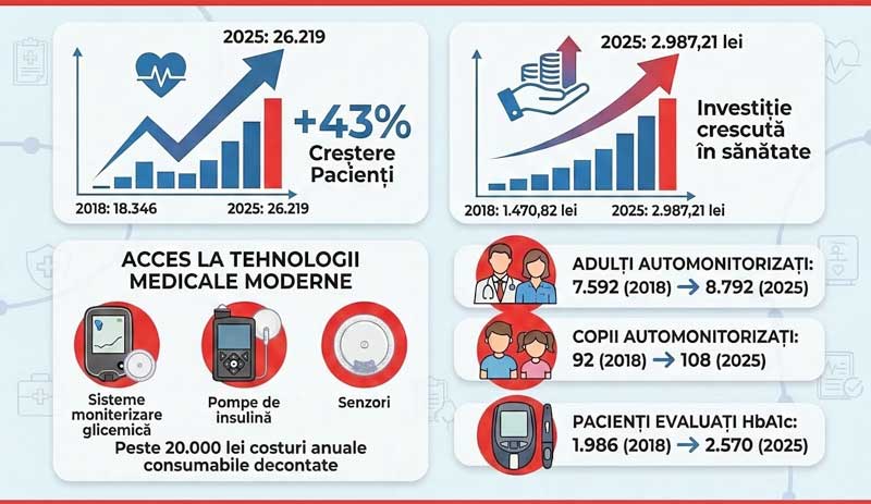 „În paralel, investiția în tratament modern a crescut constant. Costul mediu per pacient tratat a evoluat de la 1.470,82 lei în 2018 la 2.987,21 lei în 2025, reflectând accesul extins la terapii moderne, consumabile și tehnologii de monitorizare. Pacienții din Maramureș beneficiază astăzi, prin programul național, de: sisteme moderne de monitorizare glicemică continuă; pompe de insulină, inclusiv sisteme fără tubulatură externă; pompe de insulină integrate cu senzori de monitorizare. Pentru pacienții care utilizează aceste tehnologii, costul anual al consumabilelor poate depăși 20.000 lei, fiind suportat integral din Fondul național unic de asigurări sociale de sănătate”, au mai explicat oficialii instituției.