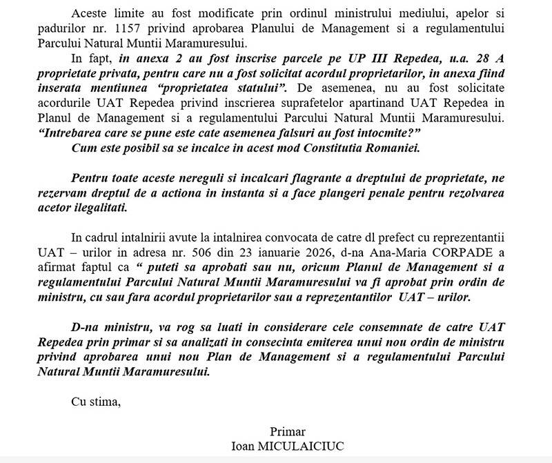 Primăria Repedea a deschis proces împotriva Parcului Natural Munții Maramureșului. Povestea începe de la o sursă de apă pe care autoritatea locală voia s-o ducă spre bazine, să-și suplimenteze rezerva de apă. S-au înțeles, apoi nu s-au mai înțeles, așa că primăria a făcut plângere până la ministra Diana Buzoianu.