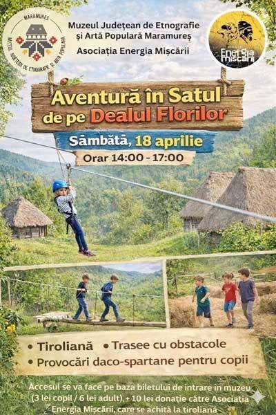 Sâmbătă, 18 aprilie, de la ora 14, sunteți așteptați cu mic cu mare la Muzeul Satului din Baia Mare, la o aventură cu obstacole. Intrarea în Muzeul Satului se face pe baza unui bilet în valoare de 3 lei / copil și 6 lei / adult, la Tiroliană se va face o donație minimă de 10 lei / 2 ture la Asociația Energia Mișcării, iar restul obstacolelor, provocărilor şi jocurilor vor fi gratuite, cu posibilitatea de a fi repetate ori de câte ori doresc copiii (tras cu arcul, cățărat pe frânghie, mers în echilibru, târâș sub plasă și multe altele). Părinții sunt rugați să îi însoțească pe copiii cu vârsta sub 9 ani.