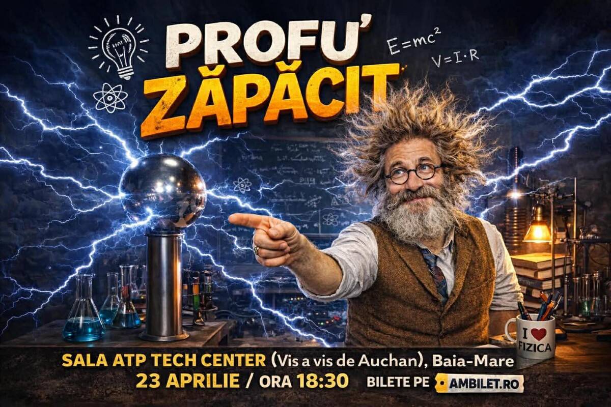 În 23 aprilie, de la ora 18.30, elevii împreună cu profesorii, părinții sau bunicii sunt așteptați la un spectacol inedit și educativ, menit să îi determine pe copii să îndrăgească discipline precum fizica și chimia. Profu’ zăpăcit își va prezenta experimentele la ATP Tech Center Baia Mare, iar cei mai curioși vor învăța „ce este forța centripetă, principiul Bernoulli, cine a fost Sir Isaac Newton, ce este comprimarea și dilatarea, de ce ne subțiază Heliul vocea, vom încerca să facem aerul vizibil și ne vom lupta cu un tun de aer etc.”