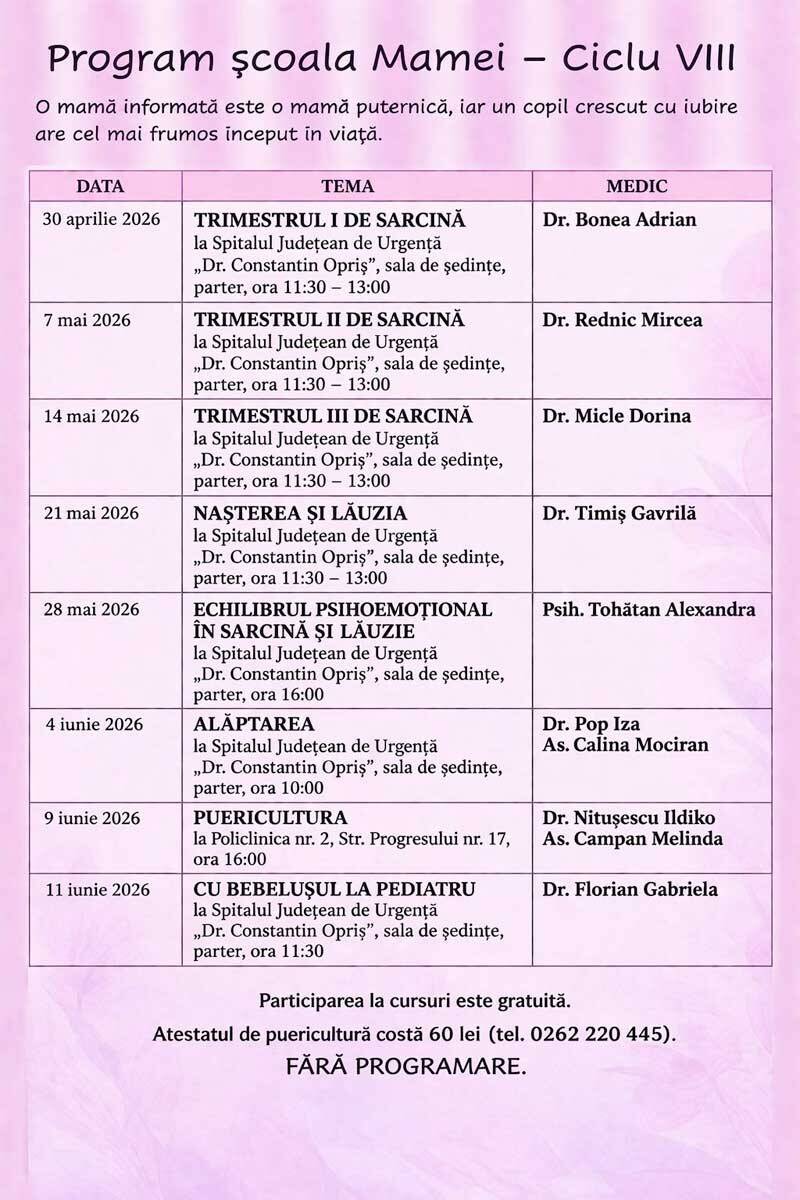 „În cadrul «Școlii Mamei», veți primi îndrumare de la medici și specialiști despre fiecare etapă a sarcinii, naștere, alăptare și îngrijirea bebelușului, dar și despre echilibrul emoțional atât de important pentru voi și pentru copilul vostru”, explică conducerea spitalului. Pentru a lua parte la cursuri, nu este necesară o programare.