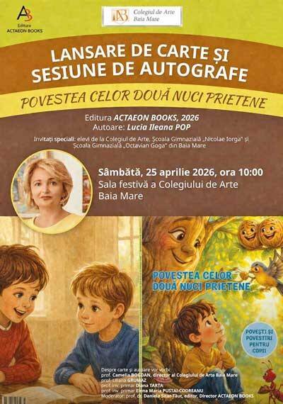 Volumul „Povestea celor două nuci prietene și alte povestiri și povești pentru copii”, autor Lucia Ileana Pop, profesor de limbă, cultură și civilizație românească în Italia, a apărut la Editura Actaeon Books, Baia Mare, 2026. Cartea va fi lansată sâmbătă, 25 aprilie, ora 10, la Colegiul de Arte din Baia Mare. Invitați speciali fiind copiii. Despre carte vor vorbi Camelia Bogdan, Liliana Grumaz, Dana Tarța, Elena Pustai Codreanu. Moderator Daniela Sitar-Tăut.